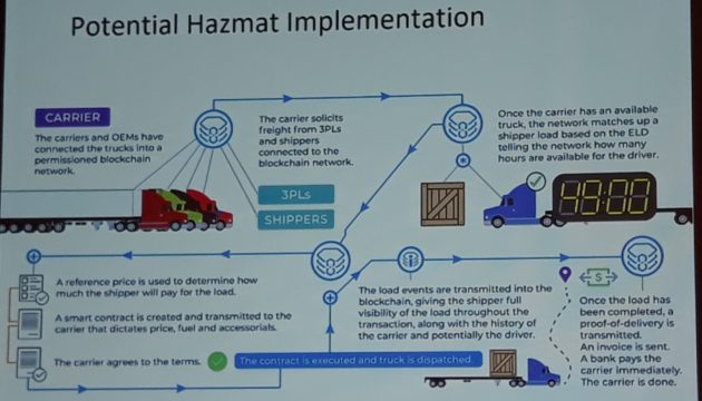 “You could add rules and conditions to guarantee that the driver is qualified to haul hazmat, or that the carrier is insured to haul hazmat. That’s built into the blockchain for every party to see.”