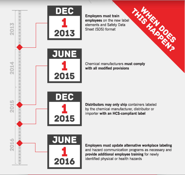 The next deadline looms now!  It is June 1st, 2015, and requires companies that manufacture hazardous chemicals and fill containers to have GHS compliant labels applied on such filled containers on and after that date.  They may not ship containers lacking this labeling from that point, with distributors under the same onus as of December 1st of the same year. (The lag in the two dates allows for the depletion of existing stock by distributors).  Below is a table to serve as a reminder of the due dates for the various deadlines associated with this new law: