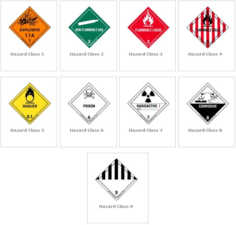 Transport labeling is intended to be applied to packages which are being shipped from one point to another; from New York, let us say, to Chicago.  It applies to the outer package – that package which is being used simply to ship the product from one point to another.  In the United States and its territories, the rules governing the required labels, markings, and other information associated with such shipments appear (as a general rule and for most items) in the 49 CFR, parts 171 through 180.  This set of regulations is governed by the Pipeline and Hazardous Materials Safety Administration, or PHMSA, an arm of the US Department of Transportation (USDOT).  Other and fairly similar rules that apply to many shipments by air or by maritime carriers are governed by the International Civil Aviation Organization (ICAO) and the International Maritime Organization (IMO).  All of these rules are based on more-or-less broadly internationally agreed to “model” or example regulations promulgated by the United Nations, and with rare exceptions are recognized to one degree or another worldwide.  Nations are allowed to and often do impose additional regulations or limitations on the ICAO and IMO regulations to suit their own differing or more highly prioritized national requirements; for instance, in the United States, rules regarding the shipment of Lithium batteries and materials toxic by inhalation feature somewhat more strict rules than those that appear in the international regulations of ICAO and the IMO. These changes are handled by a set of notices called “variations” which appear in whatever set of regulatory rules that they apply to.  Transport labeling is intended to protect the shipment and to inform people of its contents while it is traveling.  The labels (and/or placards, depending on the size and mode of the shipment) feature the familiar nine hazard classes (some of which have different divisions or sub-classes); explosives, gases, flammable liquids, flammable solids, oxidizers and organic peroxides, toxics/poisons, radioactives, corrosives, and miscellaneous hazards, thus: