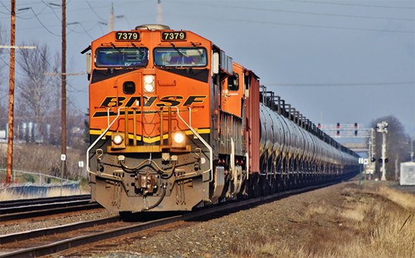 The Federal Railroad Administration announced the random substance abuse testing rates it will require of railroad employees in operating positions in 2018. The rates will remain unchanged from 2017. A BNSF oil train heads south through Auburn, Washington on New Year’s Day, January 1st, 2018. Photo © by Nikki Burgess; all rights reserved.