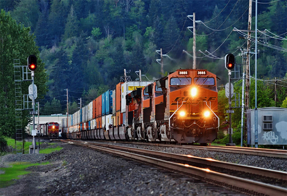 FRA delayed the implementation dates for its comprehensive revisions to the nation’s railroad employee safety training standards. A pair of BNSF trains safely pass each other in Sumner, Washington on May 6th, 2017. Photo © 5/2017 by Nikki Burgess; all rights reserved.