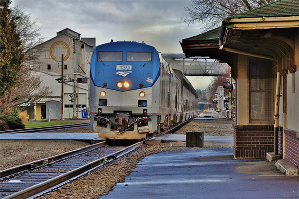 Amtrak’s “Coast Starlight” train from Seattle to Los Angeles roars across the grade crossing at Meeker Street in Kent, Washington on Sunday, February 19th, 2017. Sadly, Kent, with its many crossings is the site of numerous train/vehicle accidents. The FRA has begun a new campaign to reach younger motorists and warn them of the danger involved in ignoring crossing warnings. Image © 2/2017 by Nikki Burgess; all rights reserved.