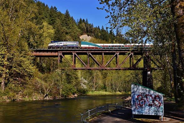The Surface Transportation Board (STB) issued a revised list of regulations that are being changed in its portfolio. The “Surf Board” helps govern US railroad operations hand in hand with the better known FRA. An Amtrak Cascade Service train led by the Seattle Seahawks Commemorative unit flies over the Nisqually River near Lacey, Washington on April 22nd, 2018. Photo © 4/2018 by Nikki Burgess; all rights reserved.