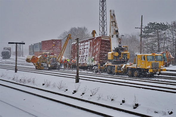 OSHA promulgated a revised proposal granting exceptions in its safety program for certain types of railroad related crane operations. In December 2014, a crane crew works in heavy snowfall to rerail a boxcar in Homewood, Illinois. Image © 12/2014 by Nikki Burgess; all rights reserved.