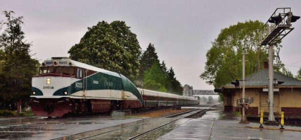 April showers bring May flowers—and a new list from the FRA noting the most hazardous rail/highway grade crossings in the country. Here an Amtrak “Cascade Service” train to Portland from Seattle roars over a road crossing in the pouring April rain in Kent, Washington on April 24th, 2016. Image © 4/2016 by Nikki Burgess; all rights reserved.