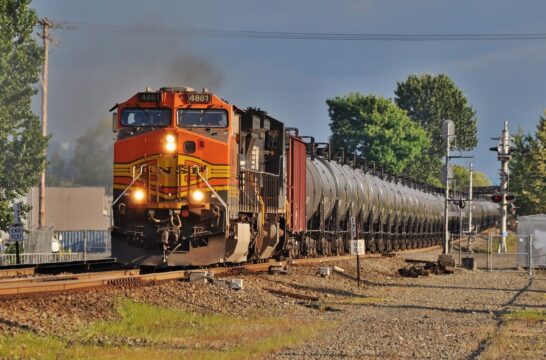 The FRA published an ICR regarding track safety conditions, a necessary component of hazardous materials shipping via rail. A BNSF oil train headed to Anacortes, Washington passes through Kent, Washington in May of 2018. Image © 5/2018 by Nikki Burgess; all rights reserved.