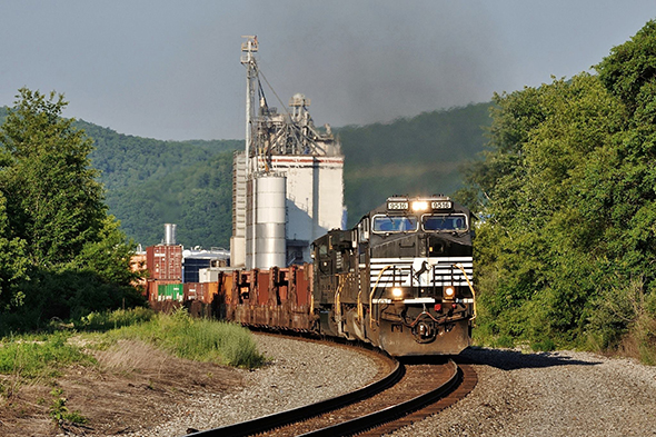 The Surface Transportation Board (STB) will hold a regulatory review and listening session next month—a chance for carriers and shippers alike to contribute to the board’s future direction. An NS intermodal train rolls by a lineside industry west of Painted Post, New York on the evening of June 12th, 2017. Photo © 6/2017 by Nikki Burgess; all rights reserved.