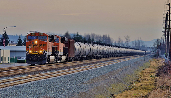 BNSF Railway intends to offer monetary discounts to certain users of tank cars in an effort to boost fleet conversion to the new DOT 117 standard. A solid train of tank cars rolls north along the BNSF through Auburn, Washington on Saturday, January 28th, 2017. Image © 1/2017 by Nikki Burgess; all rights reserved.