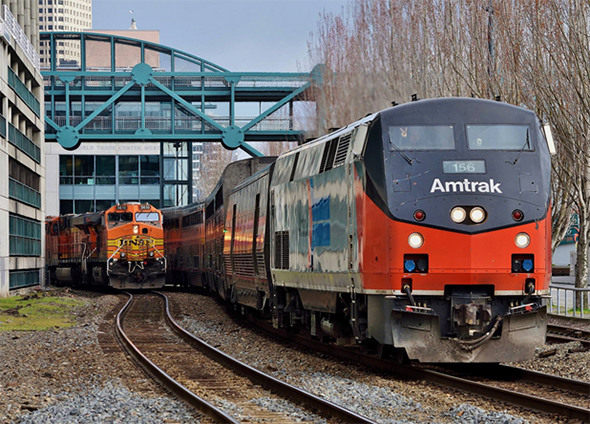 The American Association of Railroads released new safety data showing that over 99.9% of hazardous materials arrive at their destinations without any release or accident. Here Amtrak passengers and BNSF freight coexist peacefully and safely in downtown Seattle, Washington on Saturday, April 8th, 2017. Image © 4/2017 by Nikki Burgess; all rights reserved.