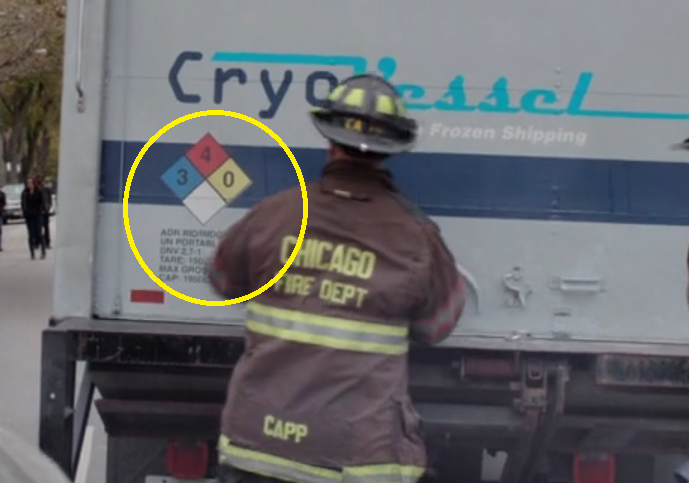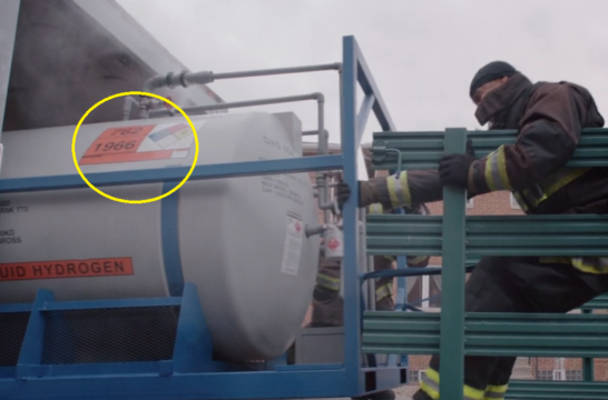 There wasn’t any placarding visible on the truck, but the show producers did get the National Fire Protection Association (NFPA) numbers for liquid hydrogen correct.