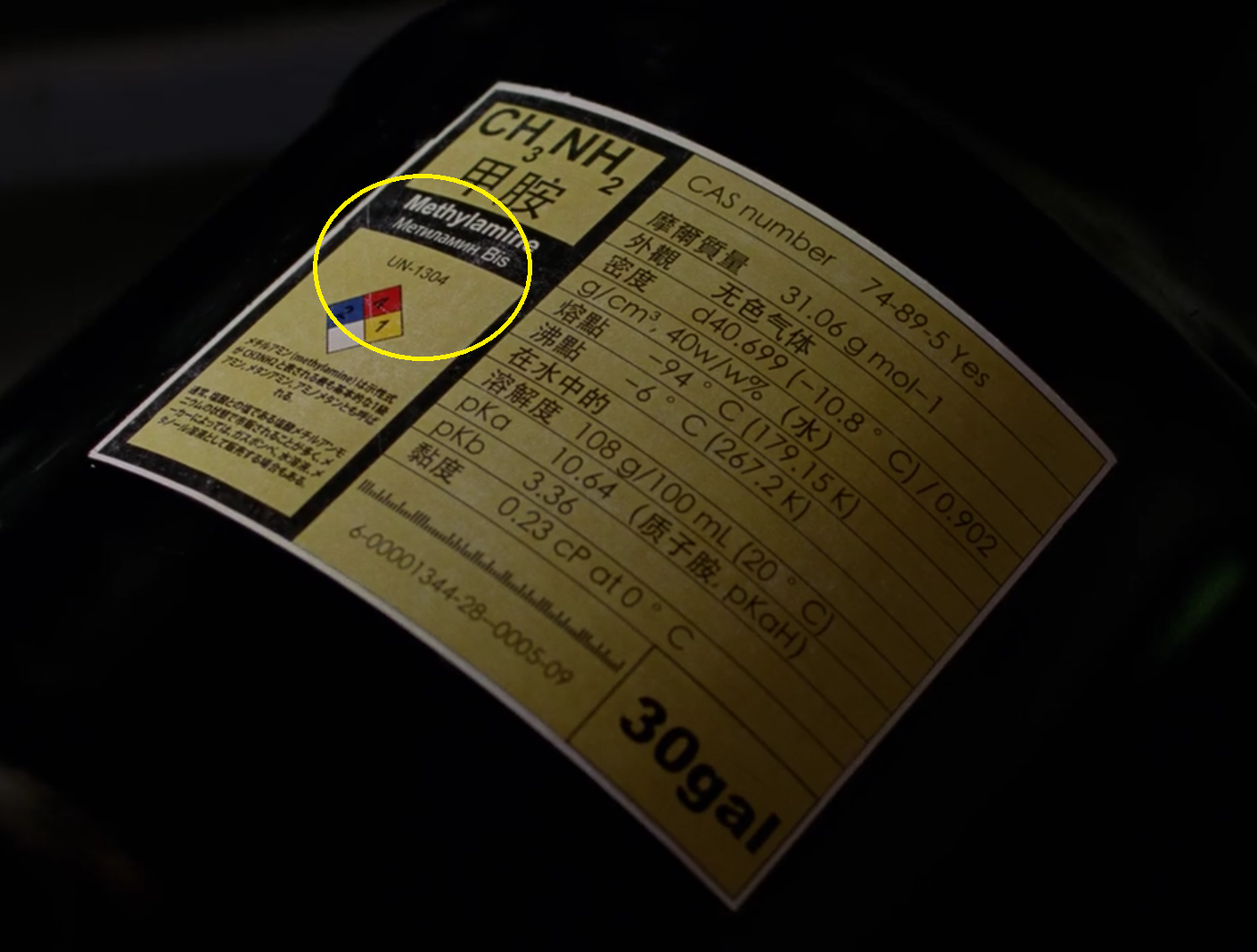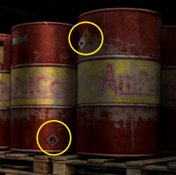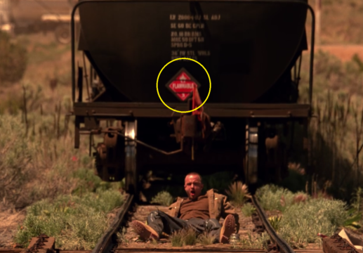 In the background of the boxcar interior, you can make out NFPA labels on the rusted drums, along with a GHS pictogram for “flammable.”
