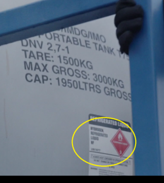 They did get the UN number correct on the UN orange label: 1966. However, the orange plate with the NFPA diamond on it is actually an EU ADR marking—it would only have a transport diamond (presumably for UN1966) as opposed to the NFPA symbol if the truck were in Europe, not Chicago! In other words, the entire marking is incorrect for U.S. use.