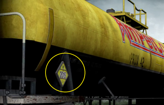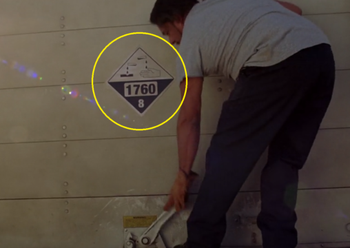 And as a final shot in that scene, we see the Class 3 Flammable placard on the tanker, which is correct, although it should have been accompanied by a Class 8 Corrosive placard as well.