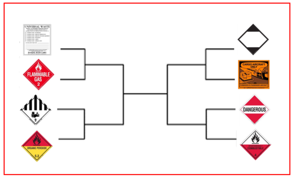 Maybe you are not a basketball fan. No problem! This is a hazmat transport blog, not a sports journal. Our Spring Psychosis* brackets pit hazmat labels, marks and placards against each other head-to-head until a single winner is left standing.