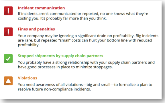 - The costs of compliance. The actual cost of maintaining compliance throughout your supply chain.