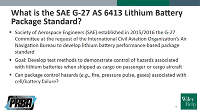 Kerchner returned Wednesday to describe the efforts of the Society of Aerospace Engineers to define standards for lithium-ion battery packaging that would be considered safe for transport on passenger aircraft. (ICAO banned the transport of standalone lithium-ion batteries as cargo on passenger planes in 2016.)