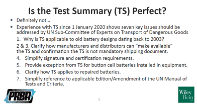 Kerchner said the test summary requirement is working, but far from perfect—and described seven key issues PRBA is urging the UN sub-committee to address.